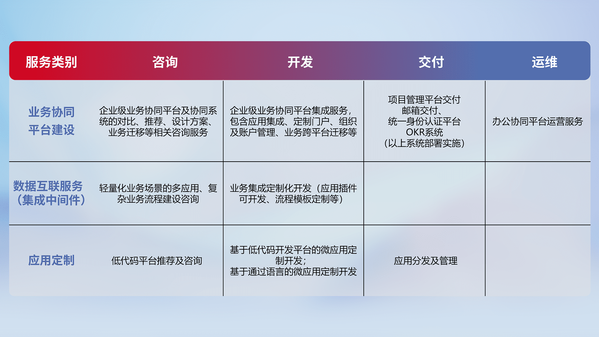 针对钉钉、、、企微、、IDaas等平台级产品提供产品的规划、、、、方案、、、、交付、、、定制化开发等服务,,,,实现如统一协同办公、、、、智能客户服务、、、混合会议管理、、、智能数据查询、、等业务场景,,实现数字化转型。。。