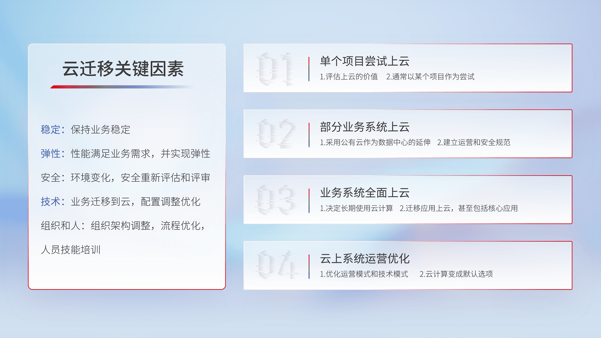 结合实际业务,,从规划设计、、、云平台选型、、、云原生改造、、数据迁移、、、、集成交付,,,,迁移全过程为客户识别最佳上云路径,,,做好风险识别管理,,设计网络架构、、、身份权限、、、、安全审计合规、、、操作审计、、、、日志审计、、、监控告警策略、、、多站点容灾设计等,,对云上基础设施进行整体规划,,,提升IT治理水平,,以满足弹性、、、高可用、、、、高性能的需求。。。。