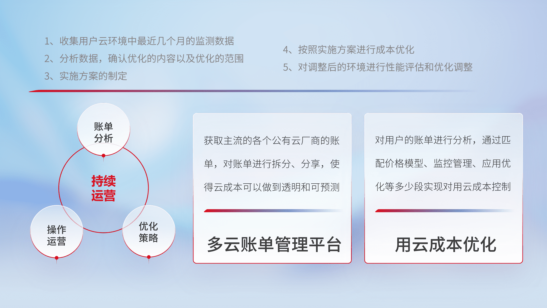 通过灵活运用多种自动化迁移工具,,帮助企业用户实现业务和数据高效 、、、稳定的上云迁移和云上迁移,,,,采用自研多云纳管平台,,以中立管理模式,,,,解决多组织、、、、多云、、、多运维厂商的复杂关系的管理,,,,保证多云平台资源配置的一致性,,实时掌控云资源运行数据,,运用智能化工具分析云资源多云平台的管理服务,,透明化管理成本支出,,,,用云成本可预测、、、用云费用可优化、、、云资源配额有据可依。。。
